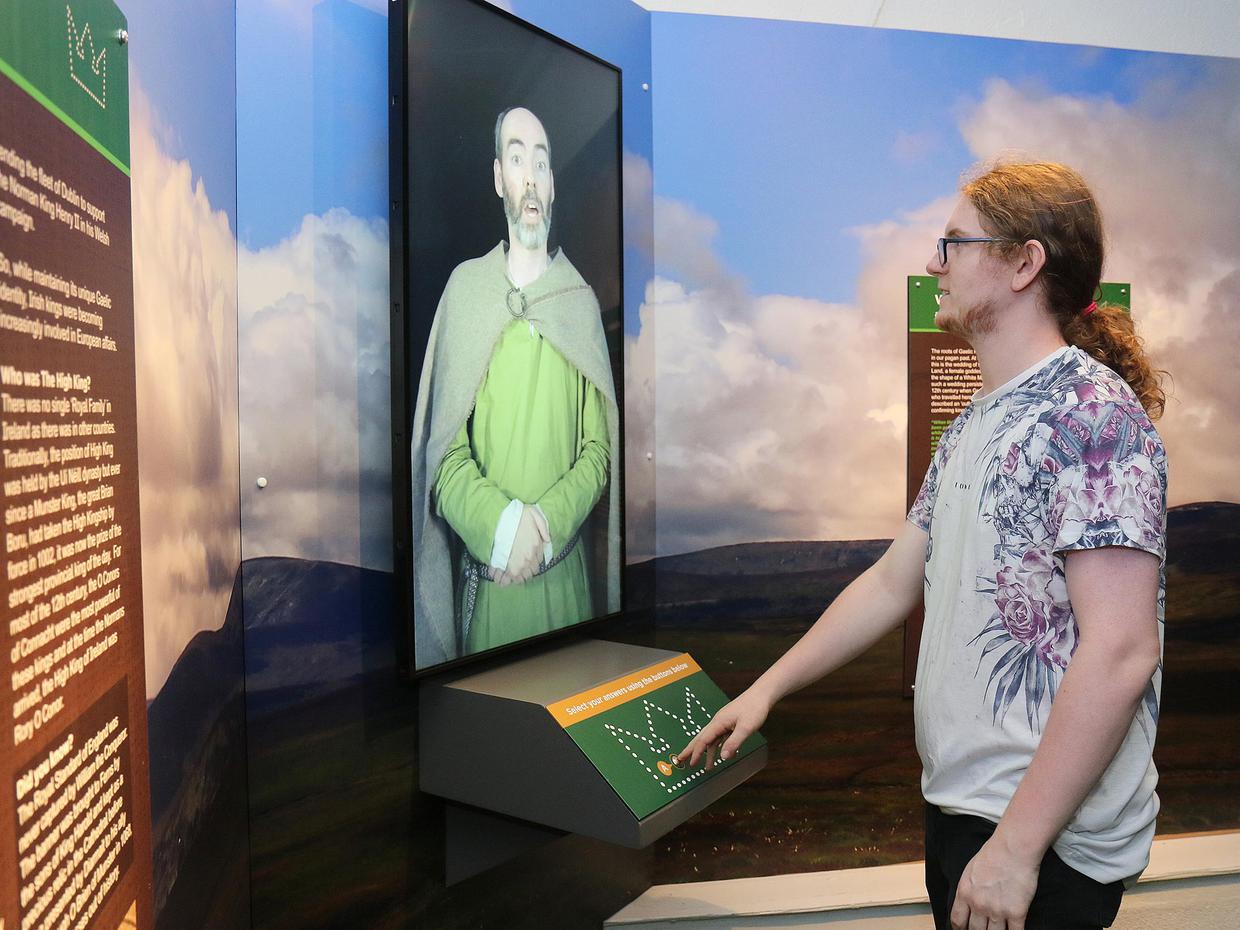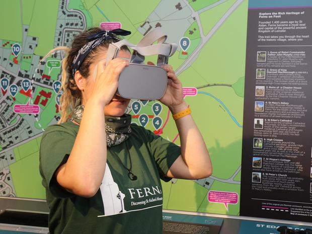 For people taking the Ireland’s Ancient East journey, a trip to Ferns is worth taking. Its rich medieval heritage played a significant role in shaping Ireland as it is today. It was from Ferns that Diarmuid MacMurrough, King of Leinster, set off to seek help in retaining power, resulting in the arrival of the Normans in 1169, thus changing the course of Irish history. In Ferns you can walk in the footsteps of medieval and Christian history, with archaeological remains testament to its title of ‘Ancient Capital of Leinster'. The Medieval Ferns Experience – a small but very complete exhibition located at Ferns Community Centre and designed by Mirador – tells the story of a time when St Aidan's monastery dominated the landscape in Ferns in the 6th and 7th centuries through to Gaelic kings, their rivalries and alliances in the 12th century. Modern technology is utilised in a brilliant way and virtual reality headsets are used as part of the tour to enable visitors to literally step back in time and immerse themselves in a period that has long been consigned to the annals of history. There is a sensory aspect to the tour as well which utilises visitors sense of touch and smell to identify artefacts that are hidden from view. There are also interactive panels and everything is easily accessible. The tour begins with a short film which features a voice over by well known RTE broadcaster, Ann Doyle, who is also a native of Ferns. The film, which lasts around eight minutes, gives an overview of the ancient history of the town and in particular the significance of St Aidan and Diarmuid MacMurrough. Visitors get the opportunity to see if they are fit to take over the Gaelic kingship by standing on the inauguration stone and answering some specific questions relating to decisions they would make if they were king. Visitors are also reminded to visit the other attractions in the town including the monastic site and Ferns Castle. Make sure to also check out the recently installed 'helmet' installations throughout the village, designed and produced by Mirador - there are five in all and each focuses on a different aspect of Ferns' history. As visitors lift the hinged helmet, a bronze sculpture by artist Toma McCullum is revealed. Each sculpture illustrates a story told through the adjacent graphic panel.