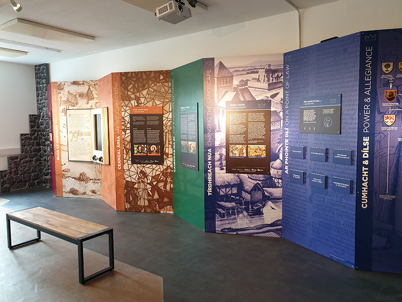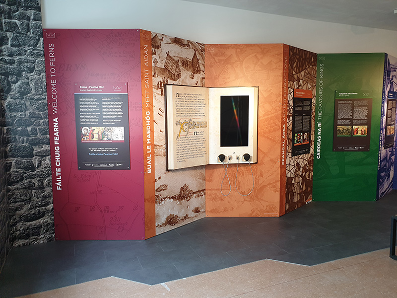 For people taking the Ireland’s Ancient East journey, a trip to Ferns is worth taking. Its rich medieval heritage played a significant role in shaping Ireland as it is today. It was from Ferns that Diarmuid MacMurrough, King of Leinster, set off to seek help in retaining power, resulting in the arrival of the Normans in 1169, thus changing the course of Irish history. In Ferns you can walk in the footsteps of medieval and Christian history, with archaeological remains testament to its title of ‘Ancient Capital of Leinster'. The Medieval Ferns Experience – a small but very complete exhibition located at Ferns Community Centre and designed by Mirador – tells the story of a time when St Aidan's monastery dominated the landscape in Ferns in the 6th and 7th centuries through to Gaelic kings, their rivalries and alliances in the 12th century. Modern technology is utilised in a brilliant way and virtual reality headsets are used as part of the tour to enable visitors to literally step back in time and immerse themselves in a period that has long been consigned to the annals of history. There is a sensory aspect to the tour as well which utilises visitors sense of touch and smell to identify artefacts that are hidden from view. There are also interactive panels and everything is easily accessible. The tour begins with a short film which features a voice over by well known RTE broadcaster, Ann Doyle, who is also a native of Ferns. The film, which lasts around eight minutes, gives an overview of the ancient history of the town and in particular the significance of St Aidan and Diarmuid MacMurrough. Visitors get the opportunity to see if they are fit to take over the Gaelic kingship by standing on the inauguration stone and answering some specific questions relating to decisions they would make if they were king. Visitors are also reminded to visit the other attractions in the town including the monastic site and Ferns Castle. Make sure to also check out the recently installed 'helmet' installations throughout the village, designed and produced by Mirador - there are five in all and each focuses on a different aspect of Ferns' history. As visitors lift the hinged helmet, a bronze sculpture by artist Toma McCullum is revealed. Each sculpture illustrates a story told through the adjacent graphic panel.